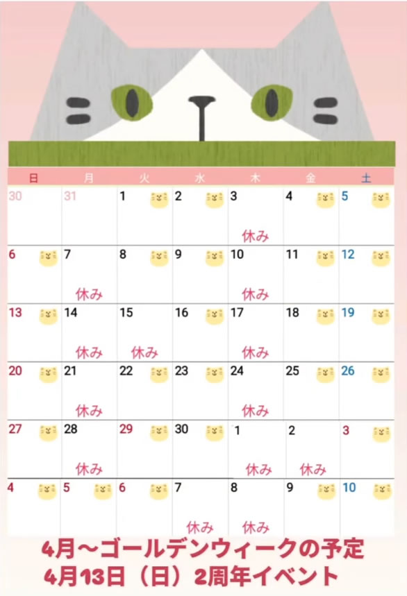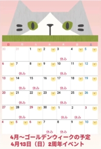 お知らせ 2025年4月営業日のお知らせ 2025.04.01 お越しの際には、InstagramやGoogleマップ等で営業日のご確認をして頂き、ご来店下さいますようどうぞよろしくお願いいたします。 Category:お店からのお知らせ Author:pili-ohana /blog/blog_comments/captcha/30586469 /blog/blog_comments/get_token ≪ 2周年記念イベントのお知らせ
