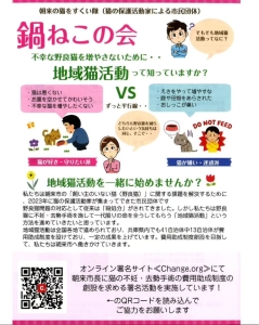 朝来の猫を救い隊『鍋ねこの会』 2024.07.09 プレスリリース 昨年から個人保護活動家と共に朝来市の不幸な猫を減らしたいと活動を始めました。何事も何から始めたらいいかわからないまま…今年に入りチラシを作 続きを読む