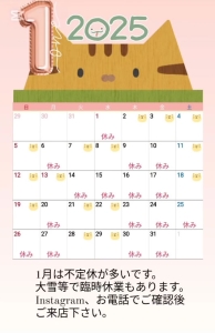 1月の定期日です。1月は不定休が多いです。 大雪等で臨時ご休業もあります。 お越しの際には、Instagramやお電話にてご確認後、 ご来店